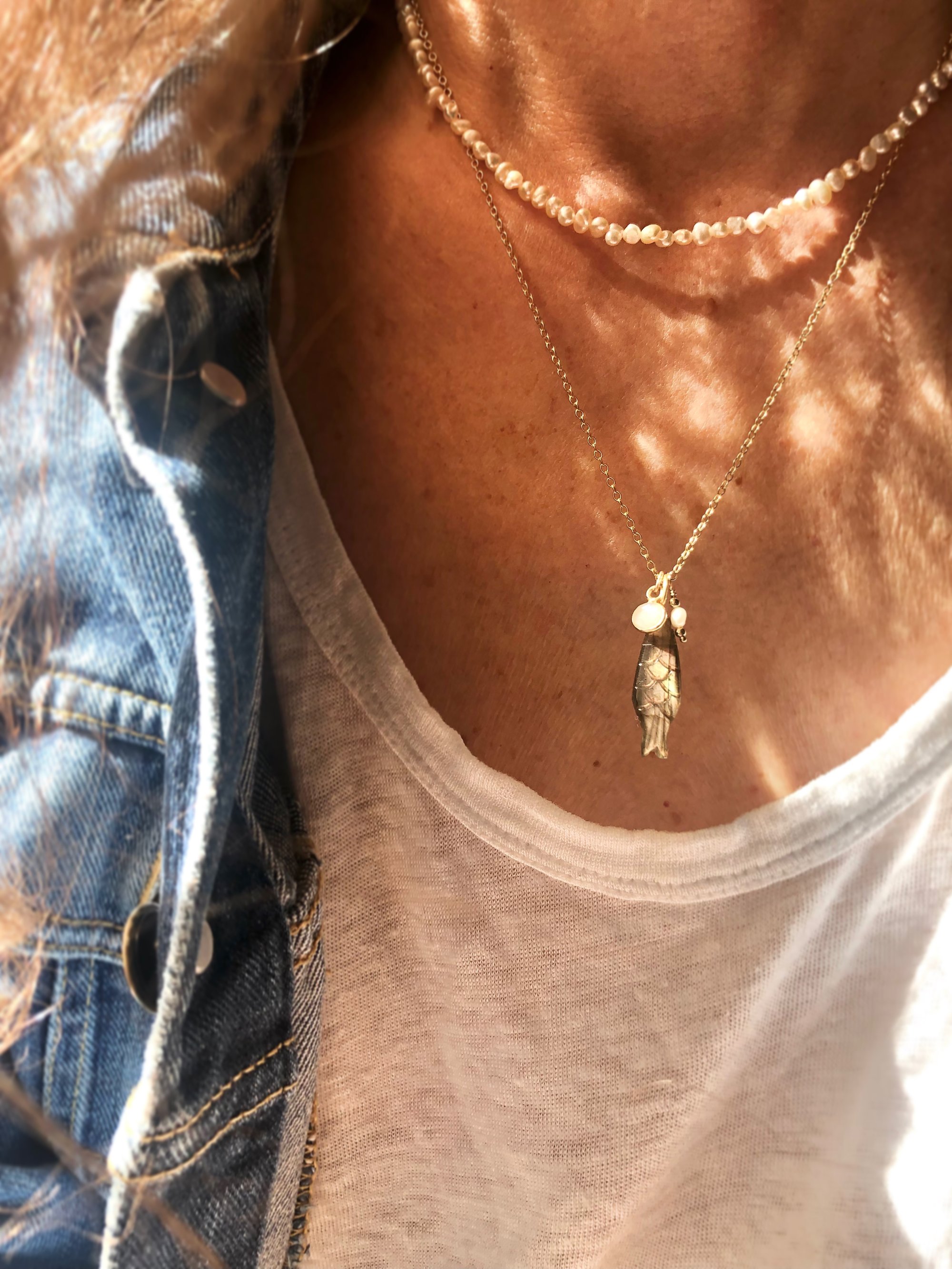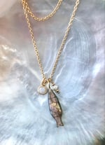 Collier composé d’un pendentif poisson en Labradorite, sculpté à la main, de petits charms en pierre de lune et perle d’eau douce.